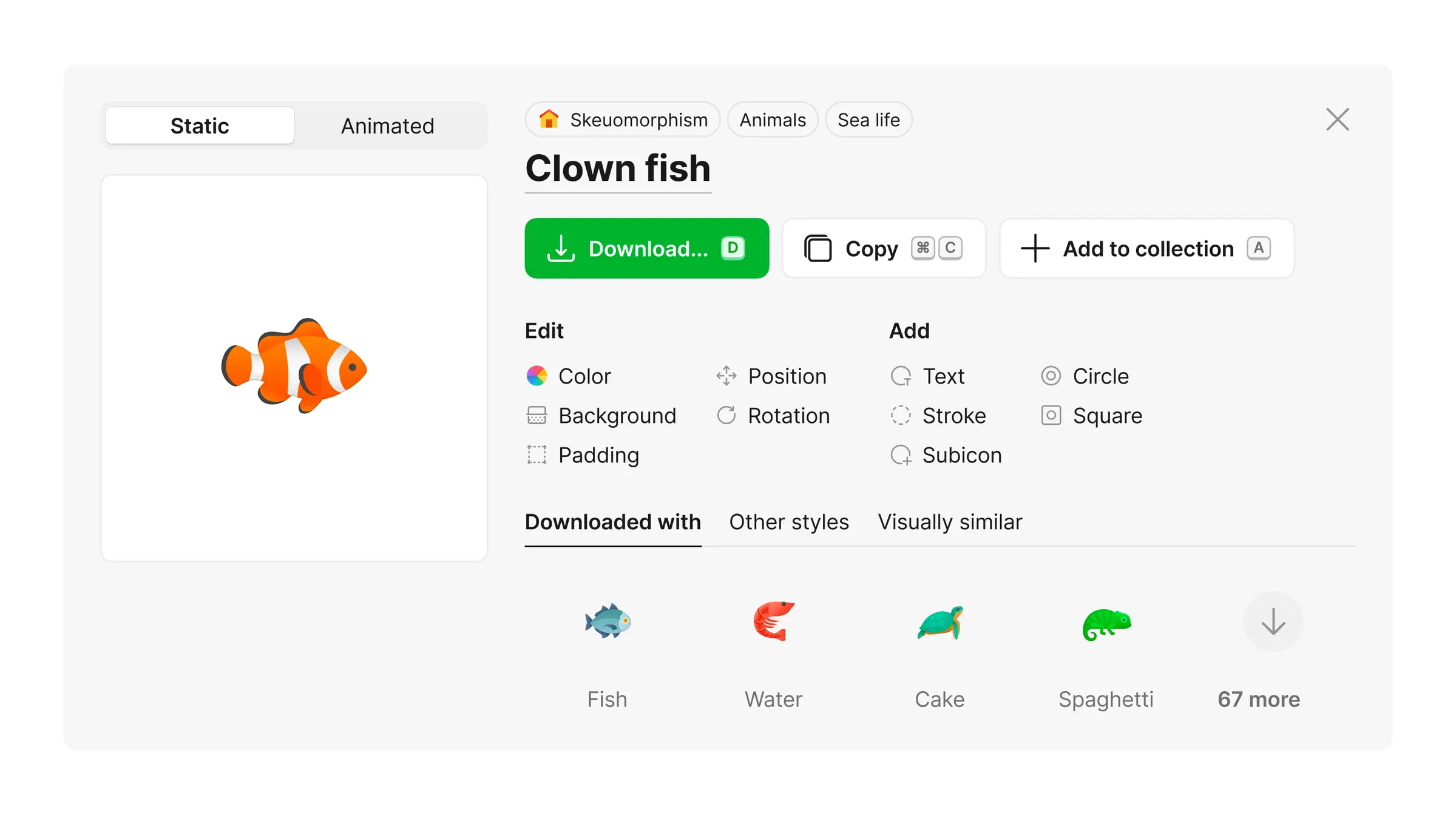 SVG, PNG, PDF, GIF, Lottie, After Effects — dozens of formats and sizes. The challenge: give access to all of this without overwhelming someone who just wants a 24px PNG. Smart defaults handle the common case; everything else is one click away.