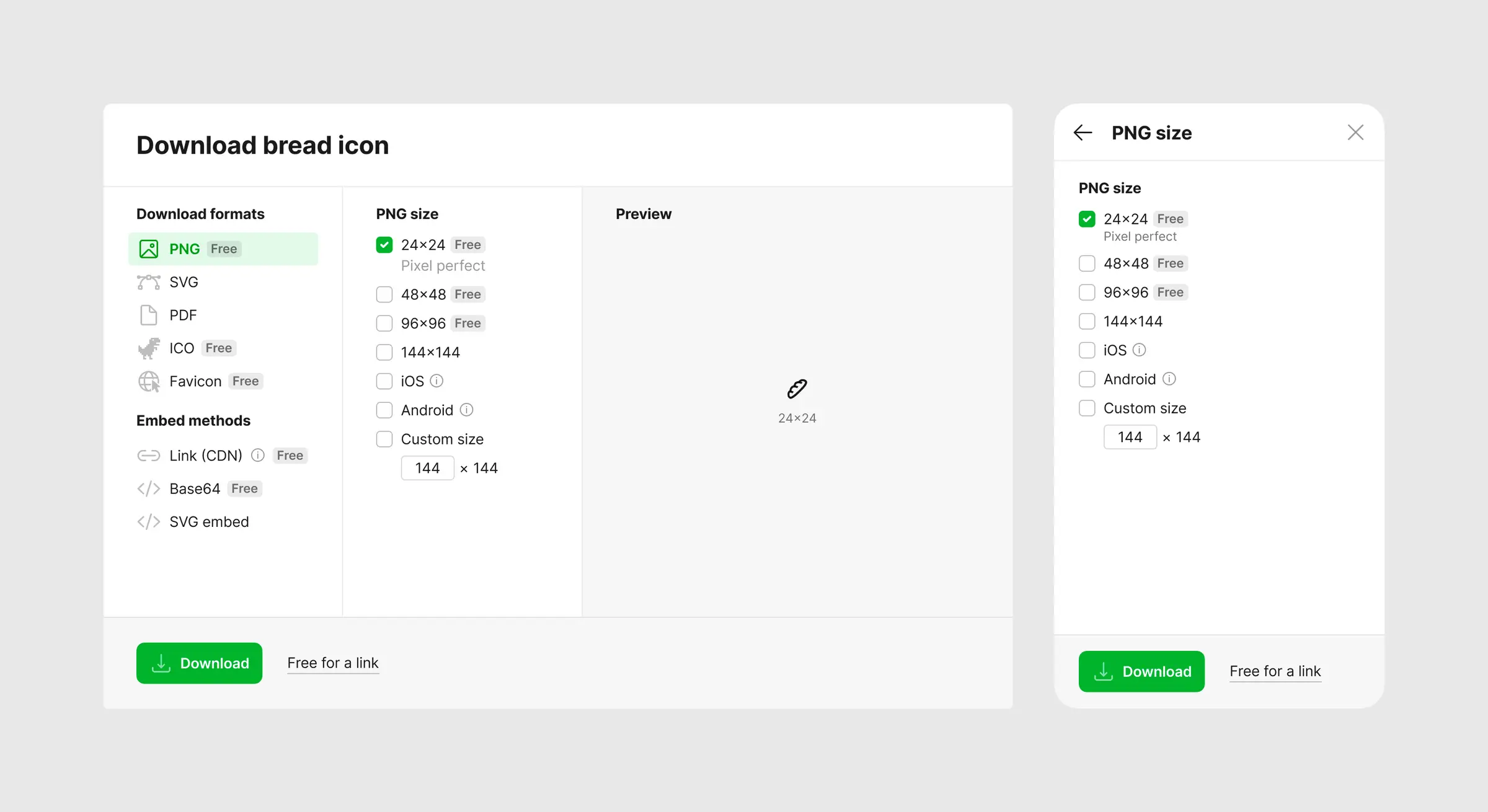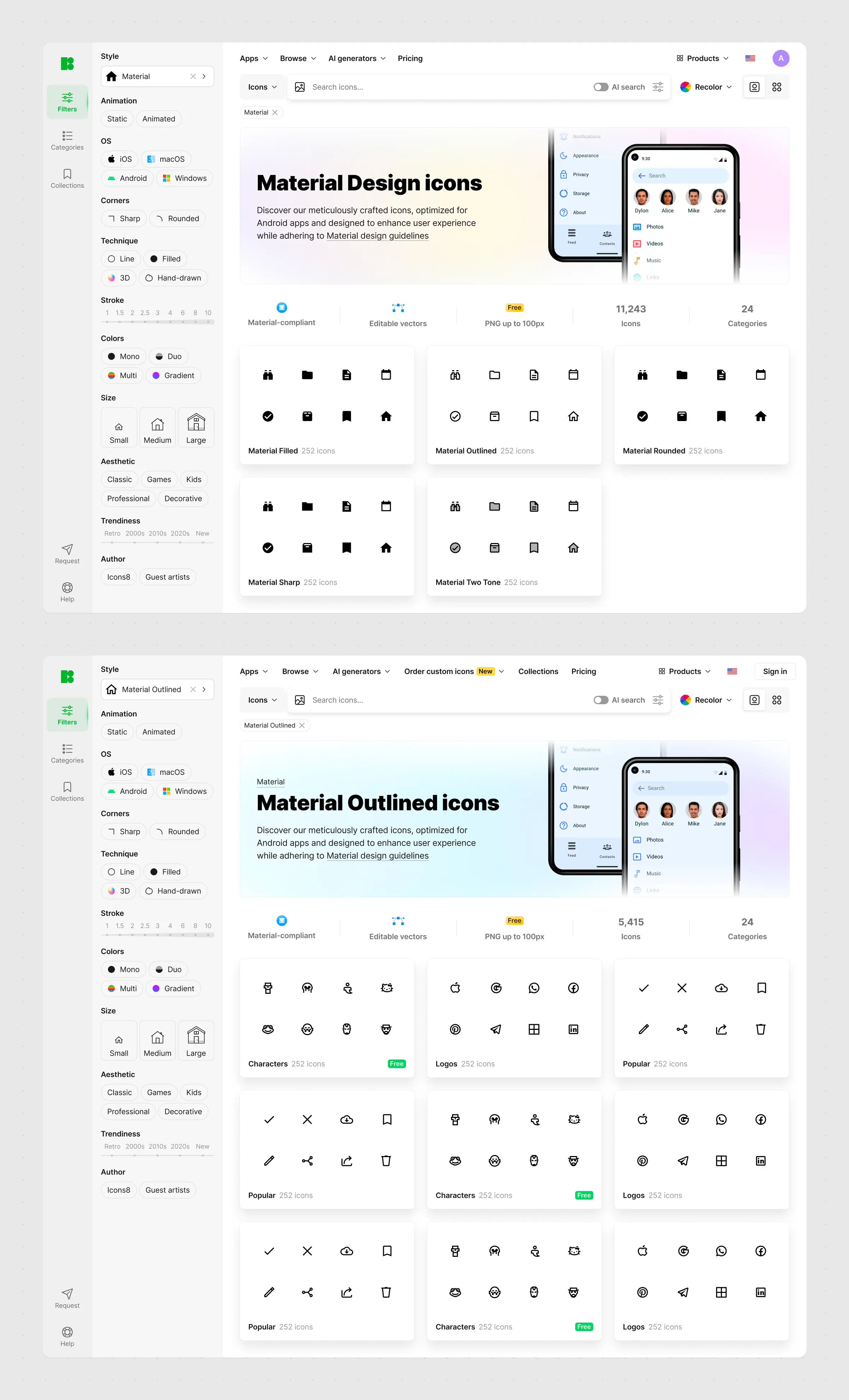 A dedicated page for each icon — previews on different device surfaces, related icons, available styles. Most users find icons through search and download from there, but the icon page is the deep-dive view and a major landing page from Google.