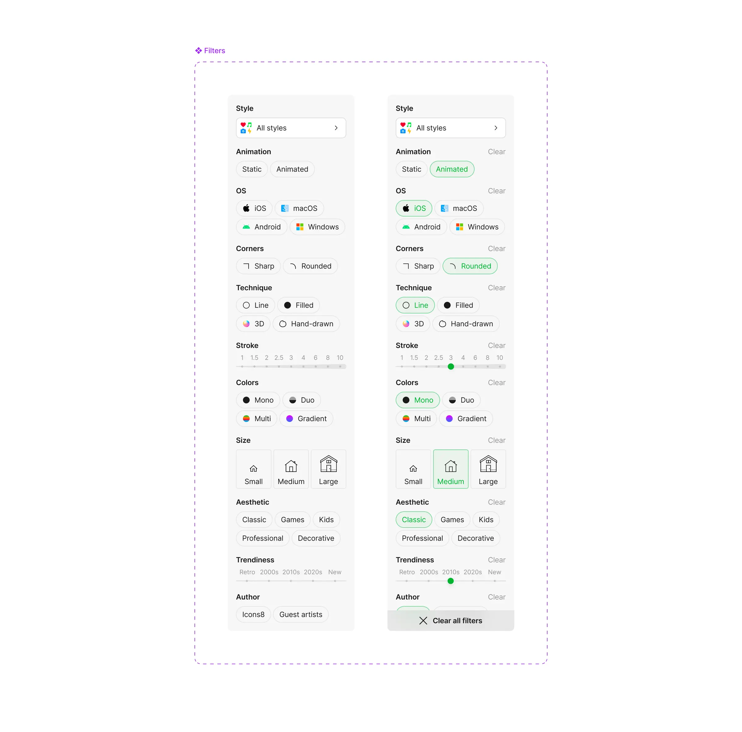 45+ styles, multiple OS targets, varying line weights and colors — keyword search alone wasn't enough. Filters narrow results by style pack, platform, line weight, color mode, and more.