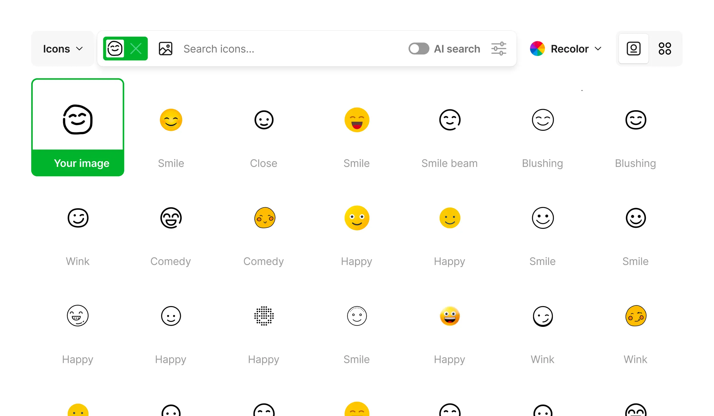 You know what you want but can't describe it. Upload a sketch, screenshot, or photo — the app finds matching icons.